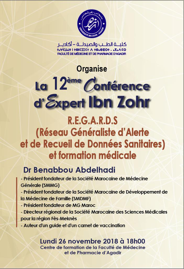 La faculté de médecine et de pharmacie d'Agadir a organisé la 12ème conférence d'Expert Ibn Zohr sous le thème : REGARDS (Réseau Généraliste d'Alerte et de Recueil de Données Sanitaires) et formation médicale.